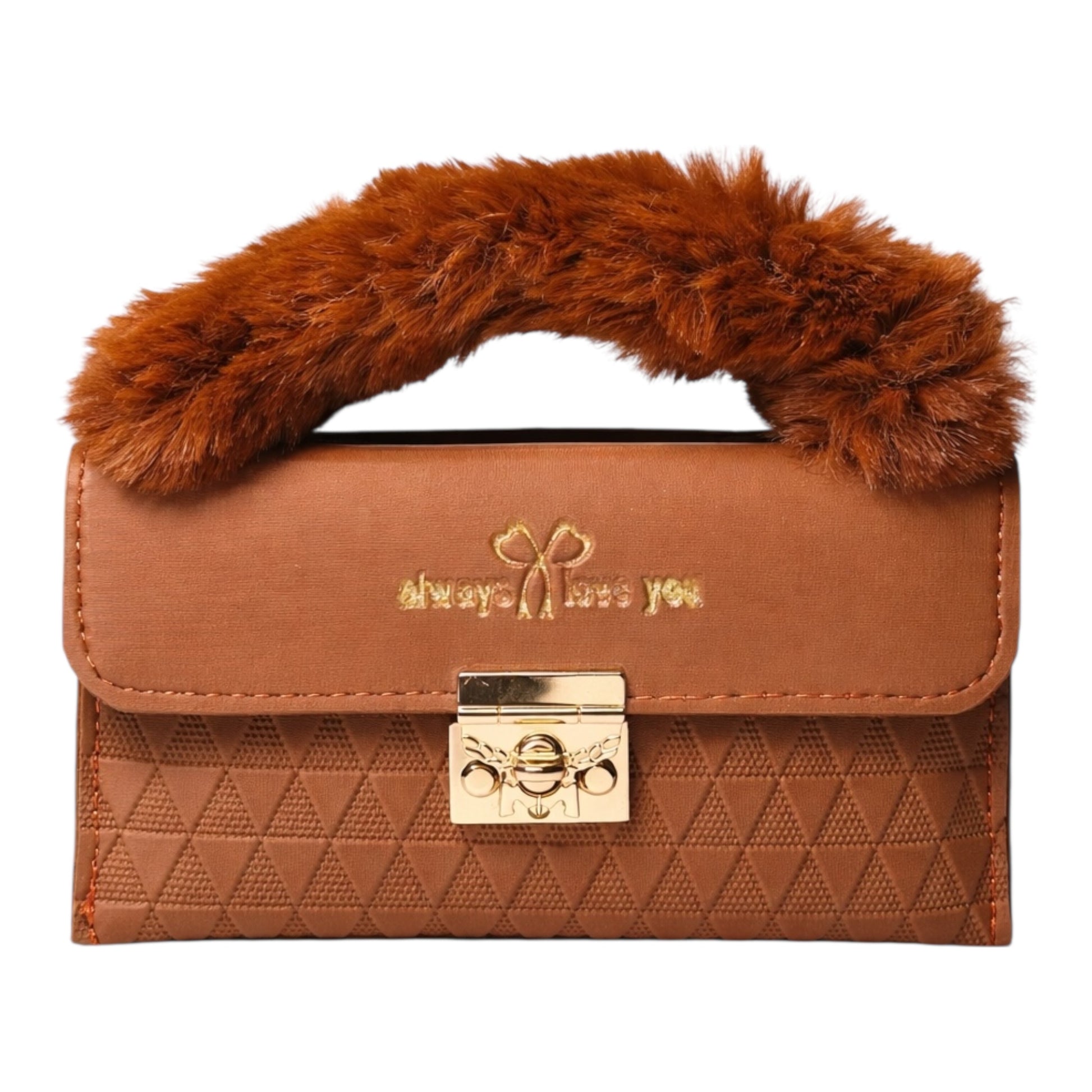 A stylish mini handbag with a quilted finish and soft fuzzy handle, designed to add warmth and charm to your everyday or evening look.