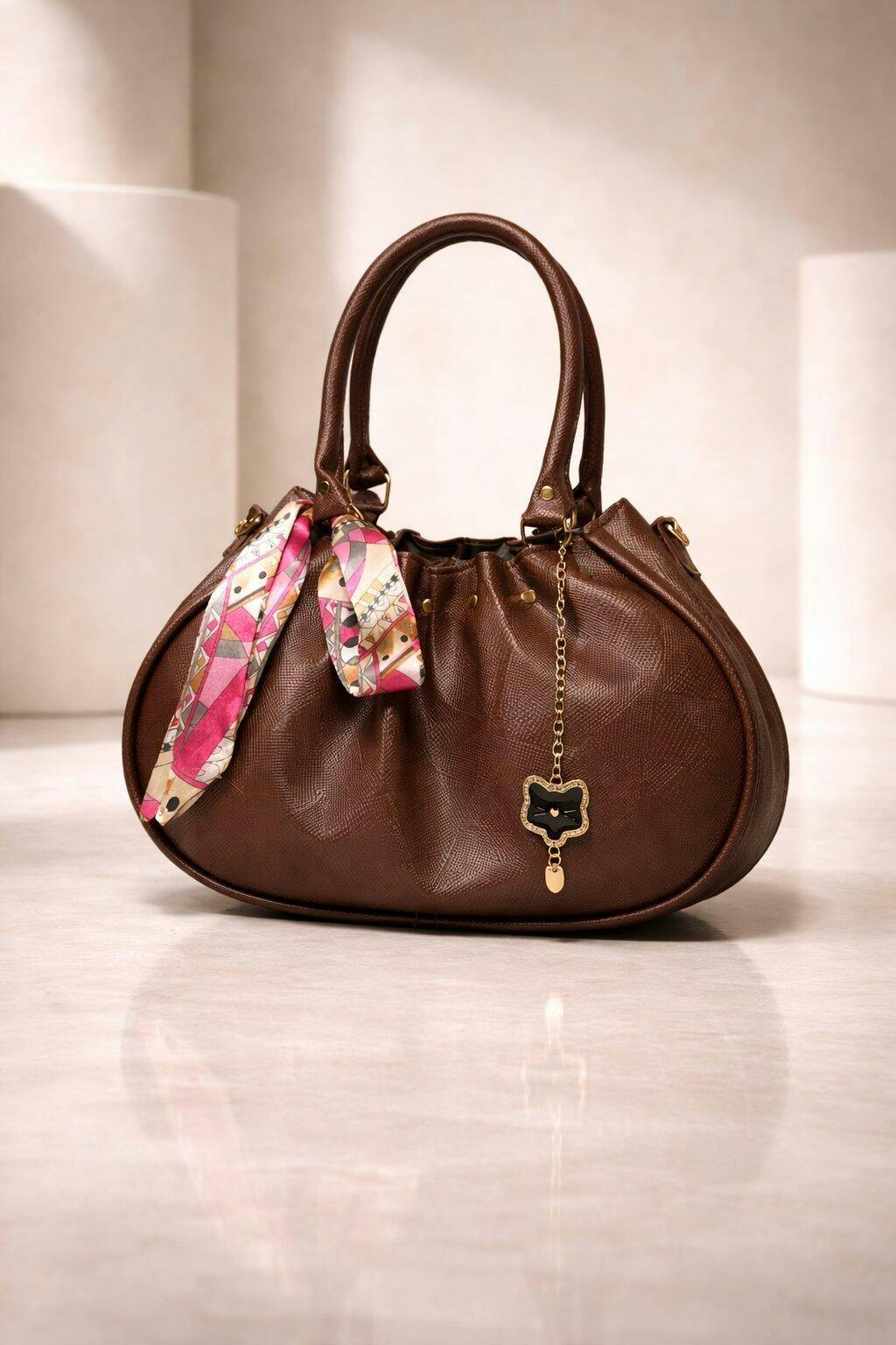 A soft, gathered handbag with a graceful silhouette, finished with a printed scarf accent and elegant charm perfect for refined everyday styling.
