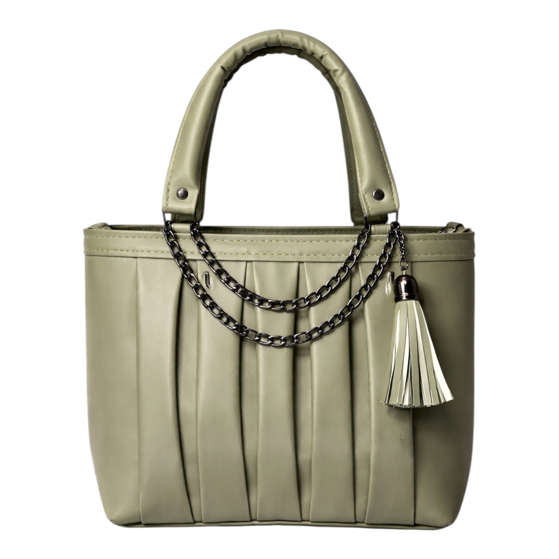 A modern structured handbag with elegant pleated detailing, chain accents, and a tassel charm crafted for effortless everyday style with a refined finish.